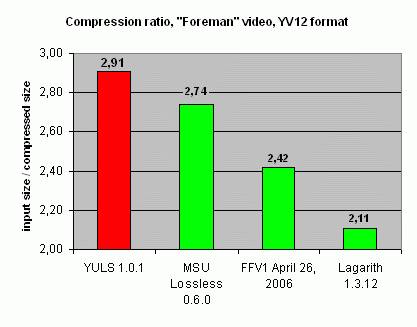 DescriptionYUVsoft's Lossless Video Codec (YULS) was designed to achieve maximum compression. Currently it provides the best compression ratio among all known lossless video codecs. It is confirmed by an extensive comparison using a representative test set. Click here to download the full comparison. This codec works with RGB24, YV12 and YUY2 color formats and uses the Video for Windows (VfW) application interface. YULS can be used with VirtualDub and other programs supporting VfW codecs. Due to high complexity, the codec is not suitable for video capture or non-linear editing. The codec is FREE for non-commercial use. Please read the user license.